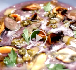 Preparazione del riso Carnaroli: lavate un mazzetto di basilico e preparate un pesto, ne dovrete avere 50 g, usando olio extravergine “Cartoceto Dop”.
