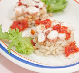 Nel frattempo frullate il coriandolo con il brodo di gamberi, la colatura di alici, 35 ml d’acqua e il succo di lime. Passate al colino e successivamente alla garza per togliere le eventuali impurità. Disponete il risotto allo zafferano in piatti fondi da portata aggiungete tre cucchiai di sugo al coriandolo. Terminate grattugiando i semi di nespola.