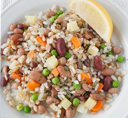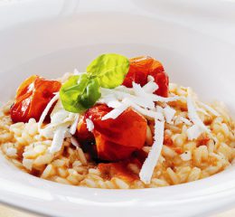 Aggiungete il riso Carnaroli, fatelo tostare, quindi sfumate con il vino. Portate a cottura il riso all’ortolana aggiungendo poco per volta il brodo bollente. Aggiustate di sale e mantecate con burro e Parmigiano. Servite il risotto, un vero piatto unico, disponendogli sopra alcune fette di carré irrorate con la sua salsa.