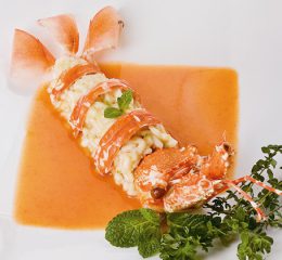 Nel frattempo scaldate e frullate la bisque di aragosta rendendola spumosa. Mantecate il risotto con il burro restante e il mascarpone, quindi mettetelo nei piatti di portata e decorate con la bisque montata e i cannolicchi. Guarnite con le erbette e l’erba cipollina e servite.