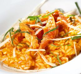 Continuate la cottura del risotto aggiungendo poco alla volta il brodo bollente e a metà cottura le animelle. Salate e pepate, quindi togliete dal fuoco e mantecate con il Parmigiano e il burro. Servite il risotto decorando ciascun piatto con alcuni filamenti di porro fritti.