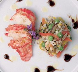 Avviare il risotto soffriggendo la cipolla nel burro, versare il riso Carnaroli, sfumare con il vino bianco, aggiungere il brodo man mano che il riso lo assorbe e sugo di vongole. Mantecare con burro e il vinaigre. Nel frattempo dorare in padella i dorsi di merluzzo, bagnare con il burro e il succo di limone a fine cottura. Togliere la pelle.