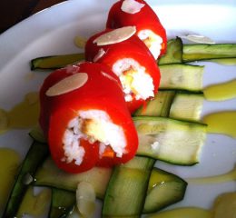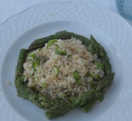 Preparazione del riso: cuocete i piselli in acqua salata, scolateli, raffreddateli e passateli al mixer, quindi setacciate il preparato con un colino in modo da ottenere una crema. Togliete la pelle ai pomodori, tagliateli a quarti e privateli dei semi, poi conditeli con olio, basilico e timo e fateli cuocere in forno a 180 °C fino a quando non sono molto morbidi.