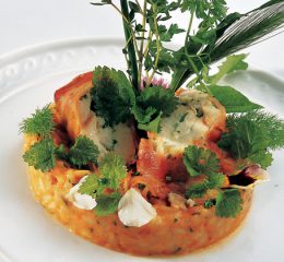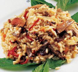 Preparazione del riso: soffriggere nel burro lo scalogno. Rosolare e tostare il riso sfumandolo con il vino. Portare a cottura con il brodo preparato precedentemente.
