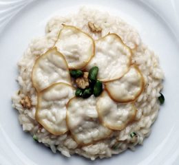 Servire il risotto cremoso, guarnendo con i dadi di pesci, le losanghe di patate fritte ed un filo di olio di prezzemolo attorno.