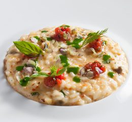 Scaldate poco olio in una casseruola antiaderente, unite l’aglio, fatelo imbiondire e aggiungete il baccalà ben dissalato e con la pelle appoggiandolo dalla parte di quest’ultima. Trasferite in forno caldo per 6-8 minuti, poi tagliatelo in quattro pezzi e mantenetelo al caldo. Tostate il riso in una pentola senza aggiungere grassi, girandolo e bagnandolo con un po’ di brodo bollente. Continuate la cottura aggiungendo poco per volta il brodo bollente (preparato con carota, sedano, cipolla e porro) e rimestando.
