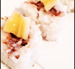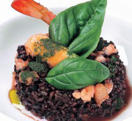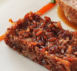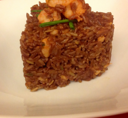 Preparazione del riso orientale: in una casseruola soffriggere con olio, la cipolla, il peperone a pezzi, l’aglio e lo zenzero. Unire il riso e tostarlo. Aggiungere piano piano il brodo sempre rimestando. Portare a cottura.