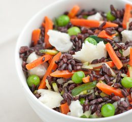 Nel frattempo in una padella con olio friggere le chele con le spezie per 1 minuto. Aggiungere la salsa di soia e il cavolo cinese. Continuare a cuocere per altri 3-4 minuti finchè le foglie saranno ammorbidite. Mischiarci l’olio di sesamo. Servire il riso orientale decorandolo con il composto a base di granchio e una spruzzata di aglio di serpe tagliuzzato.