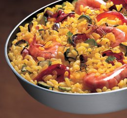 Unite il curry e il riso bianco e tostatelo per qualche minuto. Versate un mestolo di brodo bollente e mescolate, coprite e lasciate che il riso assorba il brodo. Aggiungete il resto del brodo, un mestolo alla volta, aspettando man mano che venga assorbito e portate a cottura.
