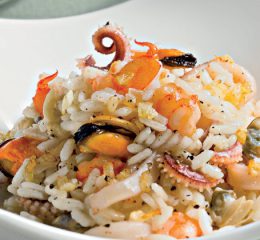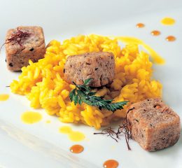 Preparazione di riso e sugo: In una padella mettere lo scalogno tritato finemente e l’olio d’oliva. Far soffriggere ed aggiungere il RISO BLOND RISOTTI. Far tostare, sfumare con il vino bianco e proseguire la cottura aggiungendo pian piano il brodo caldo. Verso metà cottura aggiungere lo zafferano sciolto in poco brodo e continuare la cottura.