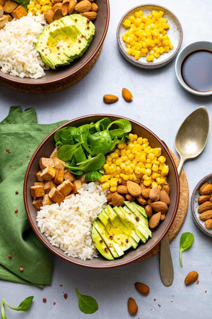 Miscelate in una ciotola 4 cucchiai di salsa di soia, 4 cucchiai di acqua e 2 cucchiai di olio extravergine. Tagliate il tofu a dadini e immergeteli nella ciotola con la marinata, avendo cura che ne siano ricoperti. Lasciate marinare per 30 minuti.