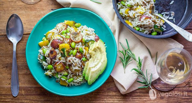 Iniziate con il lessare il riso in abbondante acqua salata, poi una volta cotto scolatelo e passatelo sotto l’acqua fredda per bloccarne la cottura. Lavate bene le verdure, poi tagliate a cubetti le zucchine e il peperone, e a fettine non troppo sottili le patate mantenendone la buccia. In una padella versate un goccio di olio e soffriggete lo spicchio di aglio intero, una volta dorato aggiungete il rosmarino tritato e dopo qualche secondo le patate a fette. Saltate a fiamma viva per un minuto, poi abbassate la fiamma, coprite con un coperchio e cuocete per 5 minuti. Unite a questo punto anche i peperoni e le zucchine e fate saltare a fiamma medio-alta per 3-4 minuti. Aggiungete infine anche gli edamame e le lenticchie e proseguite la cottura per 5 minuti. Spegnete la fiamma e condite con il prezzemolo tritato. In una ciotola versate il riso e le verdure, mescolando bene per amalgamare i sapori. Servite la vostra insalata di riso in verde tiepida o fredda, completando ogni porzione con un pizzico di rosmarino fresco tritato e qualche fettina di avocado condito con sale e limone.
