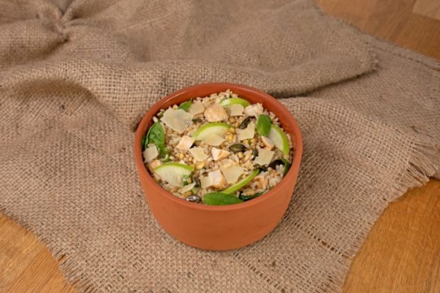 Questa ricetta costituisce un buon piatto unico giustamente energetico grazie ai carboidrati complessi, che garantiscono energia a lento rilascio, apportati dai cereali integrali, e alle proteine nobili del pollo. I semi di zucca e l’olio evo completano poi l’apporto di lipidi.