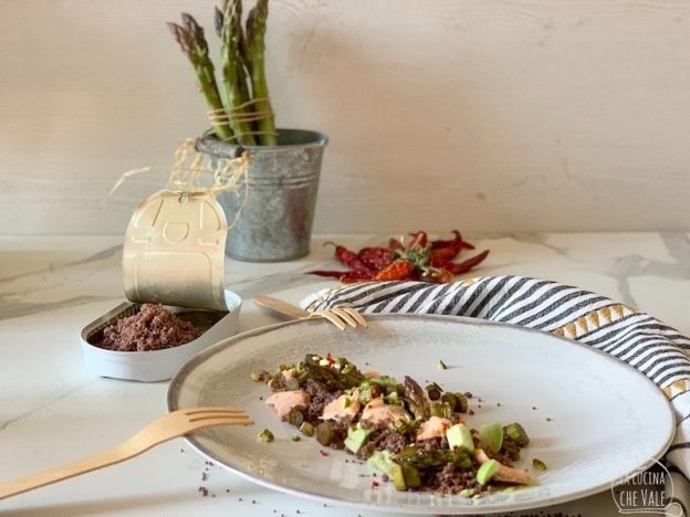 Pesare 280 g di acqua e farla scaldare fino a raggiungere il bollore. Unire il cous cous all’acqua bollente, aggiungere un filo di olio extravergine d’oliva e coprire. Lasciate rinvenire per 5 minuti. Tagliare gli asparagi a pezzetti e farli cuocere in padella con un filo di olio per 5 minuti, aggiungere poi 4 cucchiai di aceto e farlo evaporare per 30 secondi, salare. Tritare i pistacchi già sgusciati e farli tostare cucendoli in un pentolino antiaderente a fiamma alta per pochi minuti o mettendoli sotto il grill del forno. Frullare metà avocado e tagliare a dadini l’altra metà. Con una forchetta sgranare il cous cous, metterlo in padella con gli asparagi, aggiungere il salmone scolato e ridotto a pezzetti e un pizzico di peperoncino a piacere. Fare saltare per 30 secondi. Servire con la crema di avocado sul fondo del piatto, aggiungere poi i pistacchi e i cubetti di avocado. E’ buono sia caldo che freddo.