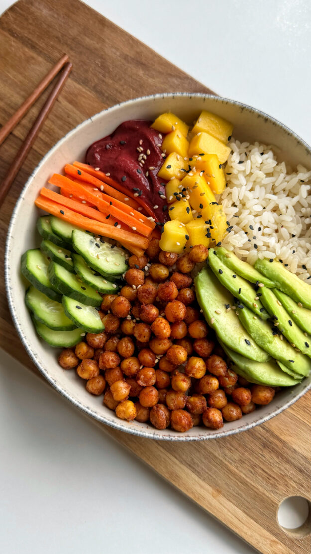 In una teglia aggiungi ceci precotti, olio, sale e paprika, mescola per bene e rendi croccanti in friggitrice ad aria, forno o padella. La cottura dipenderà molto da quanta acqua avranno assorbito i ceci: è da considerare perfetta quando i ceci risulteranno belli croccanti. A parte, taglia poi una carota, un avocado, un mango e un cetriolo.